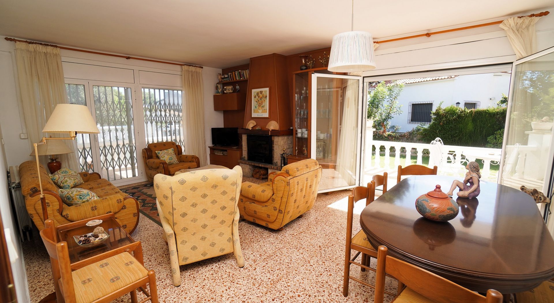 La vivienda cuenta con recibidor, salón-comedor con chimenea, cocina independiente, tres dormitorios y un baño completo. Desde el salón y la cocina se accede directamente al jardín y las terrazas. Dispone además de garaje amplio con espacio para varios coches.