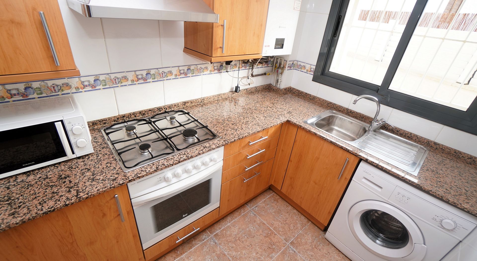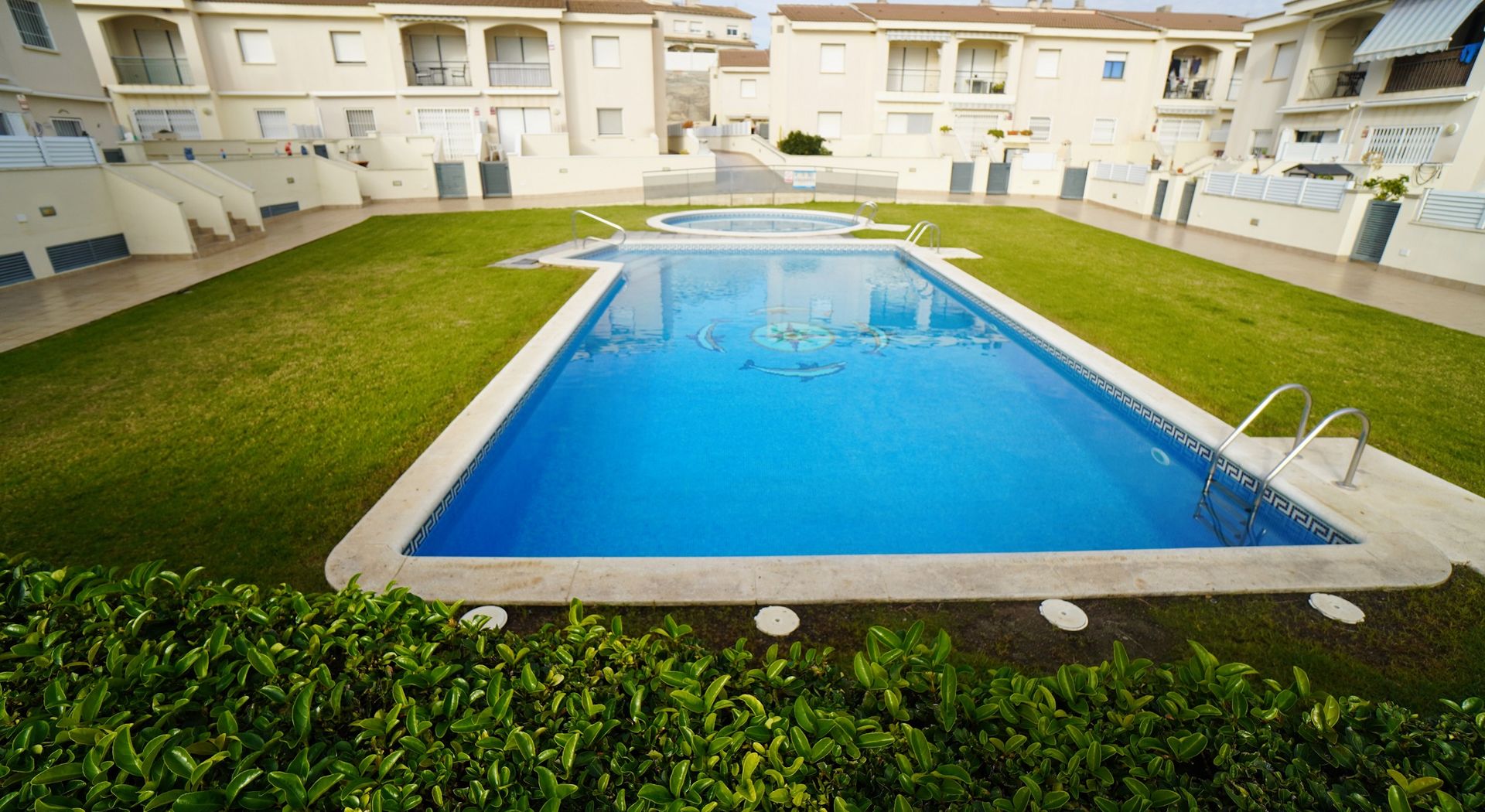 Se distribuye de la siguiente manera: recibidor, amplio salón comedor con salida a la terraza desde donde se accede directamente a la piscina, cocina independiente, baño con ducha y dos habitaciones dobles, una habitación con armario empotrado.